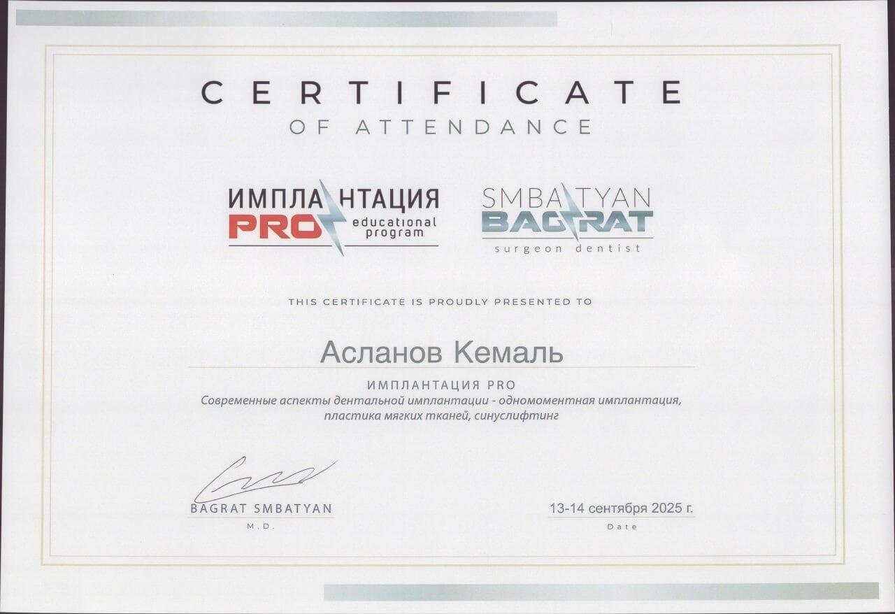 Опытный хирург-имплантолог с четырёхлетним опытом работы. Кемаль Натигович — позитивный и открытый специалист, который умеет находить подход к каждому пациенту. Он постоянно учится и развивается в профессии, а его общительность и доброжелательность помогают пациентам чувствовать себя спокойно даже перед сложными процедурами.