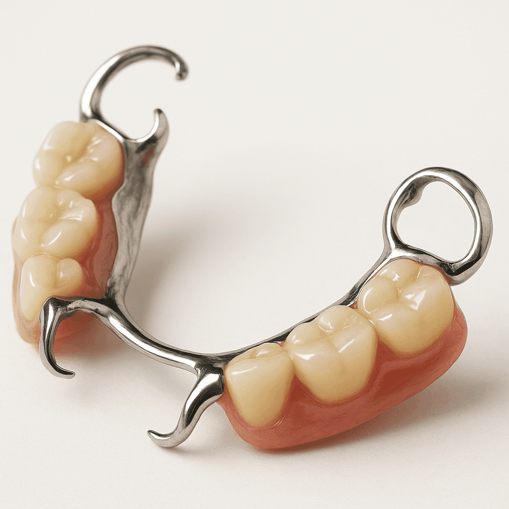 Эти конструкции получили свое название от немецкого слова «бюгель», что означает «дуга». Поэтому иногда такие системы называют также дуговыми. По форме они напоминают подкову с металлической перемычкой, которая может проходить как в передней, так и в средней или задней части неба. На этом прочном дуговом каркасе держится имитирующий десну пластиковый базис с искусственными коронками.