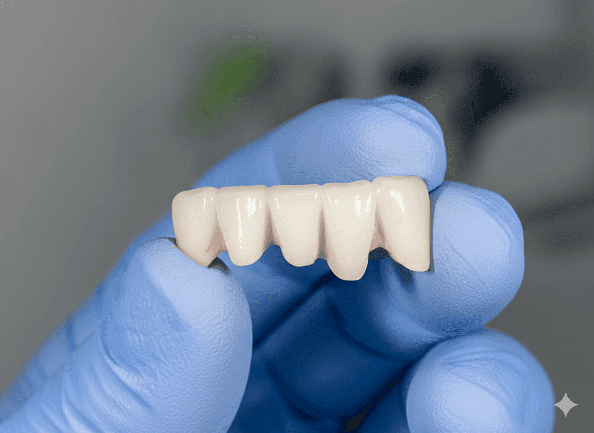 При протезировании передних зубов особое значение имеет восстановление эстетической функции утраченных единиц. Поэтому при изготовлении мостовидной конструкции выбору материалов уделяется повышенное внимание. С такой целью могут применяться: